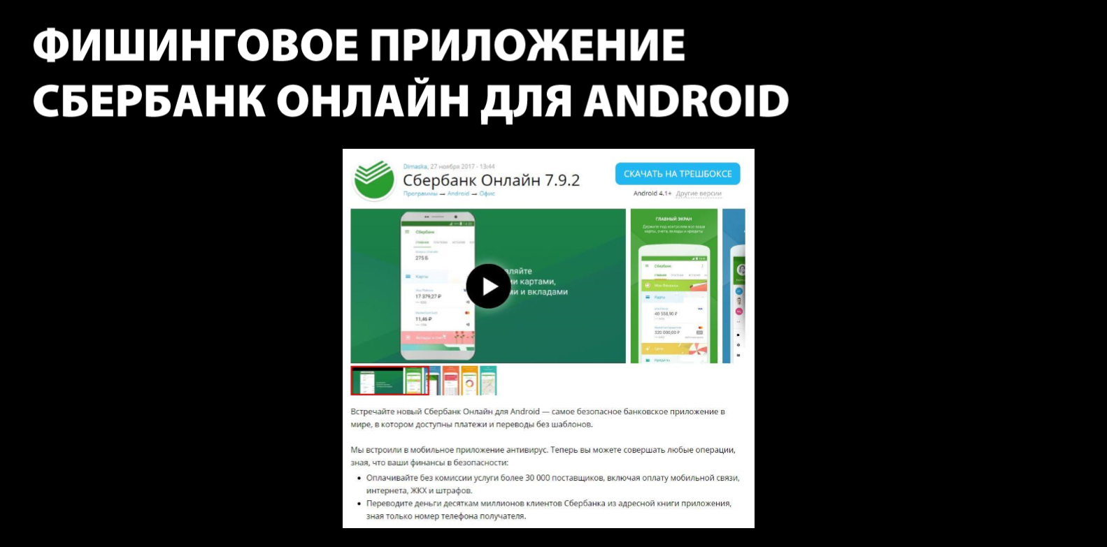 Так, было обнаружено приложение, которое имитировало мобильный банкинг от «Сбербанка России» – и воровало конфиденциальные реквизиты карт.