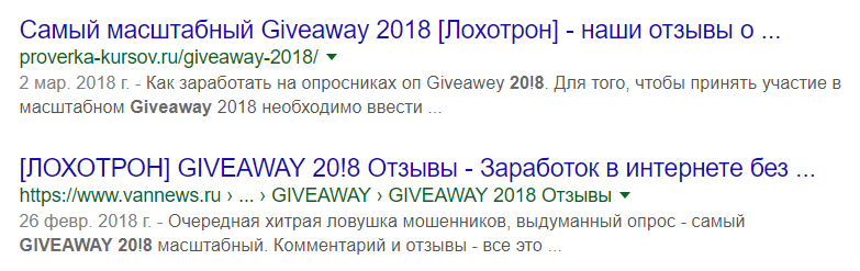 3) Отсутствие репутации – признак мошенничества. «Обычной» информации о розыгрыше «Giveaway 20!8» в Интернет нет: то есть, нет ни слова о том, что это за опрос, какая компания проводит и с какой целью. Зато в сети есть много негативных отзывов от тех, кто стал жертвой мошенников: