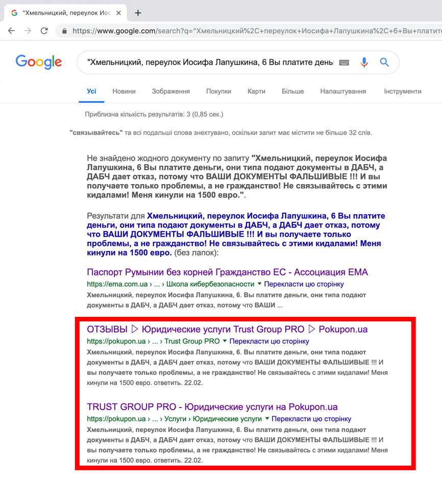 Ссылка https://pokupon.ua/harkov/merchant_pages/71014-trust-group-pro на комментарий зачищена, но Гугл все помнит и в результатах поиска все еще выдается негативный комментаий. Скриншот