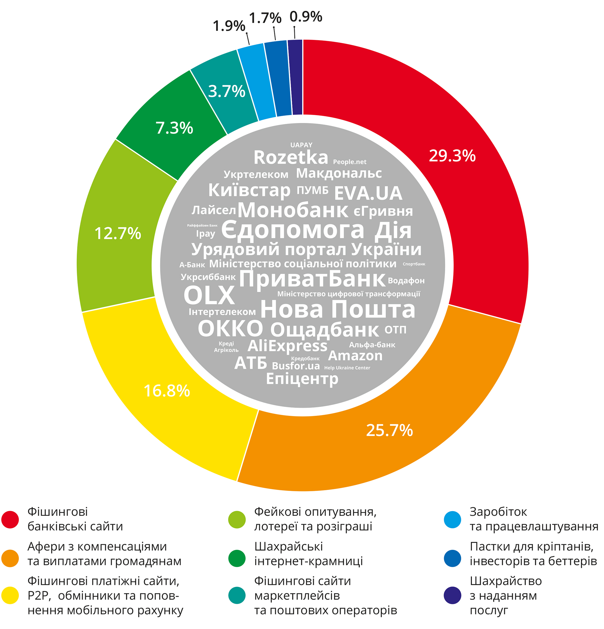 - Фішинг залишається найбільш масовою загрозою для українських користувачів Інтернет, і його масштаби неухильно зростають. Саме фішингові сайти становлять 88% заблокованих ресурсів кібермародерів. Решта 12% припадають на шахрайські інтернет-крамниці, шахрайські схеми заробітку, шахрайство з «інвестиціями» та наданням послуг, в результаті яких у громадян виманюються гроші, та сайти зі шкідливим ПЗ.
