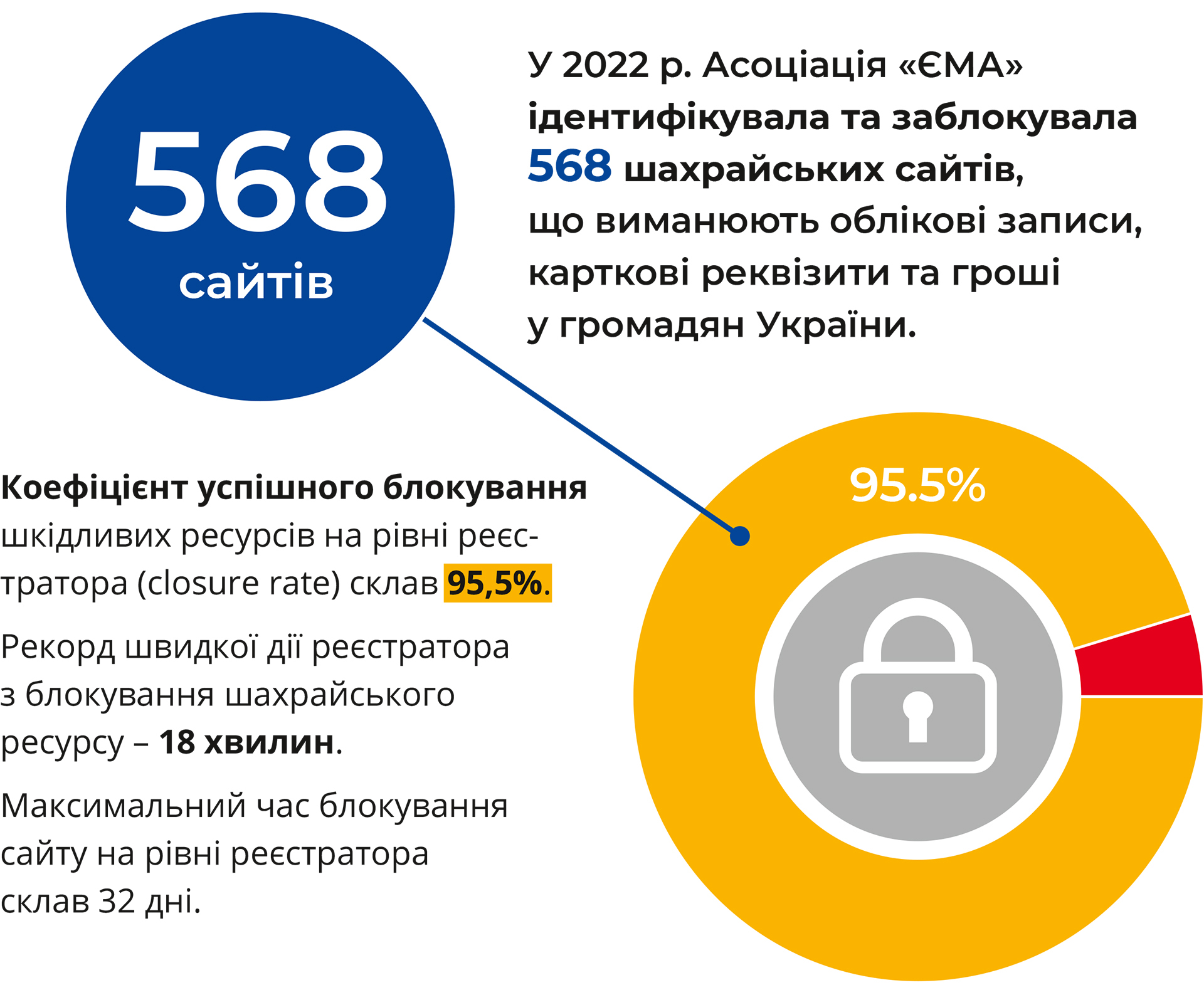 У 2022 р. Асоціація «ЄМА» у співробітництві з чеським підрозділом компанії ThreatMark (США) заблокували на рівні реєстраторів 568 активних фішингових та шахрайських сайтів в українському сегменті Інтернет, націлених проти споживачів фінансових послуг.