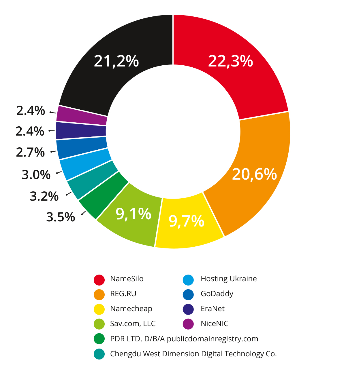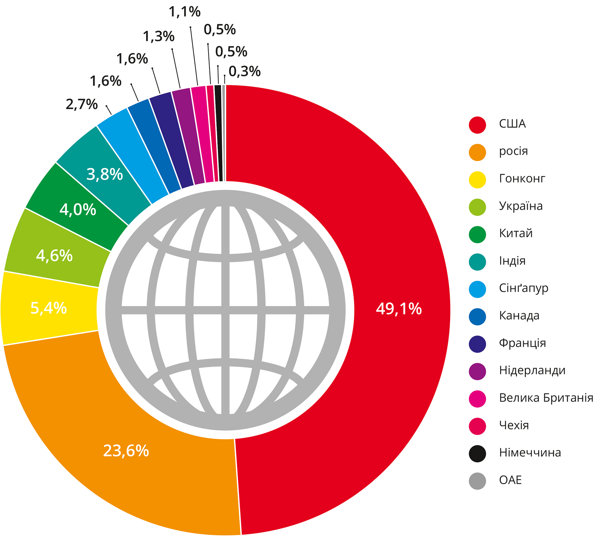 Основними країнами походження реєстраторів є США (49,1%) та росія (23,6%), що відповідає світовому тренду.