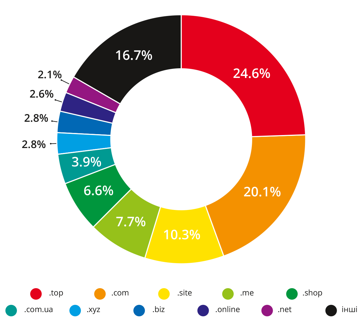 В ТОПі улюблених шахрайських TLD – ті, на яких відсутні обмеження під час реєстрації: «топова» доменна зона .top (24,6%), найпопулярніша зона світу .com (20,1%) та універсальна доменна зона .site