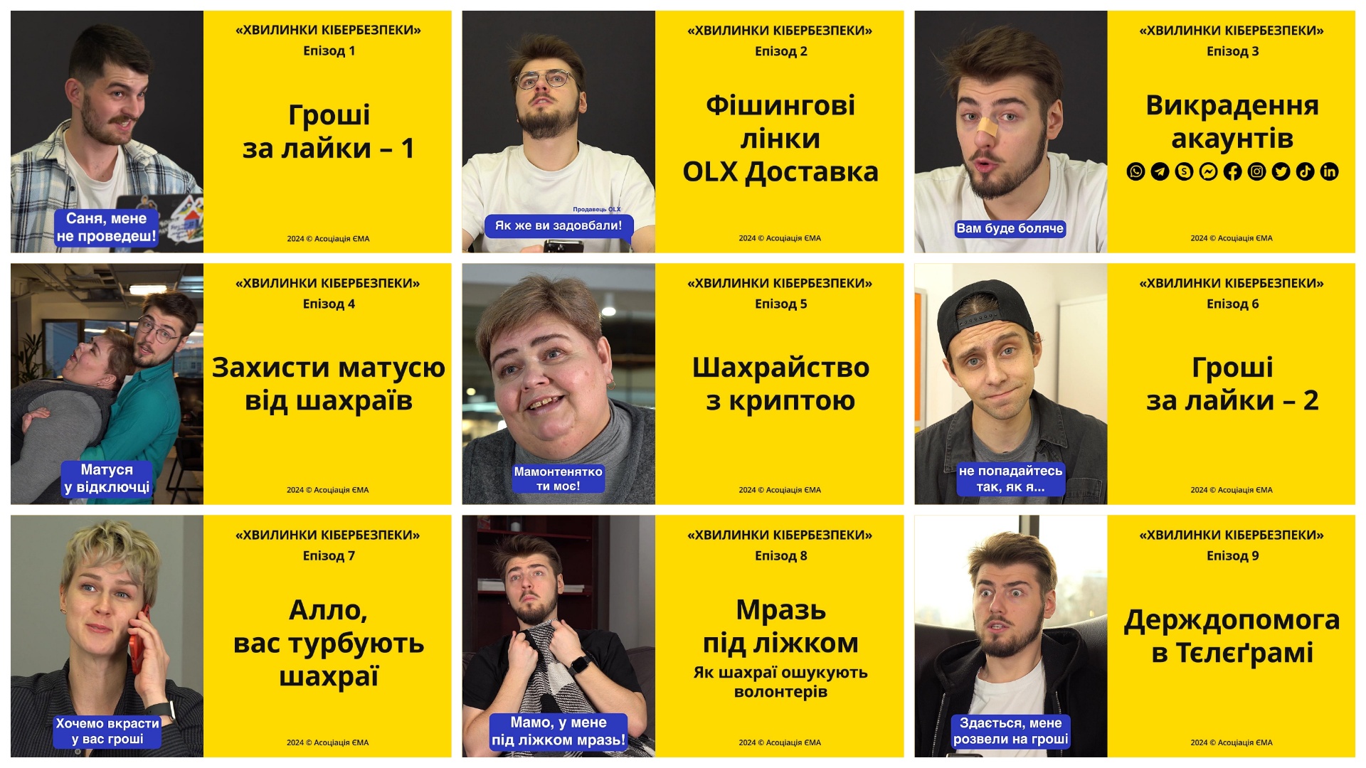 2. Асоціація ЄМА продовжує просвітницький відеопроект “Хвилинки кібербезпеки”, що навчає українців протидіяти шахраям. Цього разу ми підготували 9-ть серій коротких освітньо-розважальних антишахрайських відеороликів для соцмереж “Хвилинки кібербезпеки, 2-й сезон”, що допоможуть вашим клієнтам протидіяти платіжному шахрайству та покращити власну кібергігієну, не відриваючись від гортання стрічки соцмереж. Відео зняті у зручному для розміщення у TikTok, Instagram та Facebook вертикальному форматі та оснащені субтитрами. Всі відеоролики другого сезону відеопроєкту “Хвилинки кібербезпеки” ви можете завантажити за посиланням.