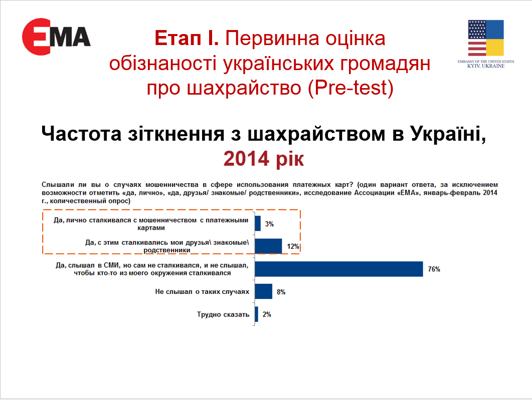 - Проведение начального тестирования уровня осведомленности граждан о мошенничества – исследование компании «Gemius Украина» и Ассоциации ЕМА. Результаты исследования приведены в этой статье.